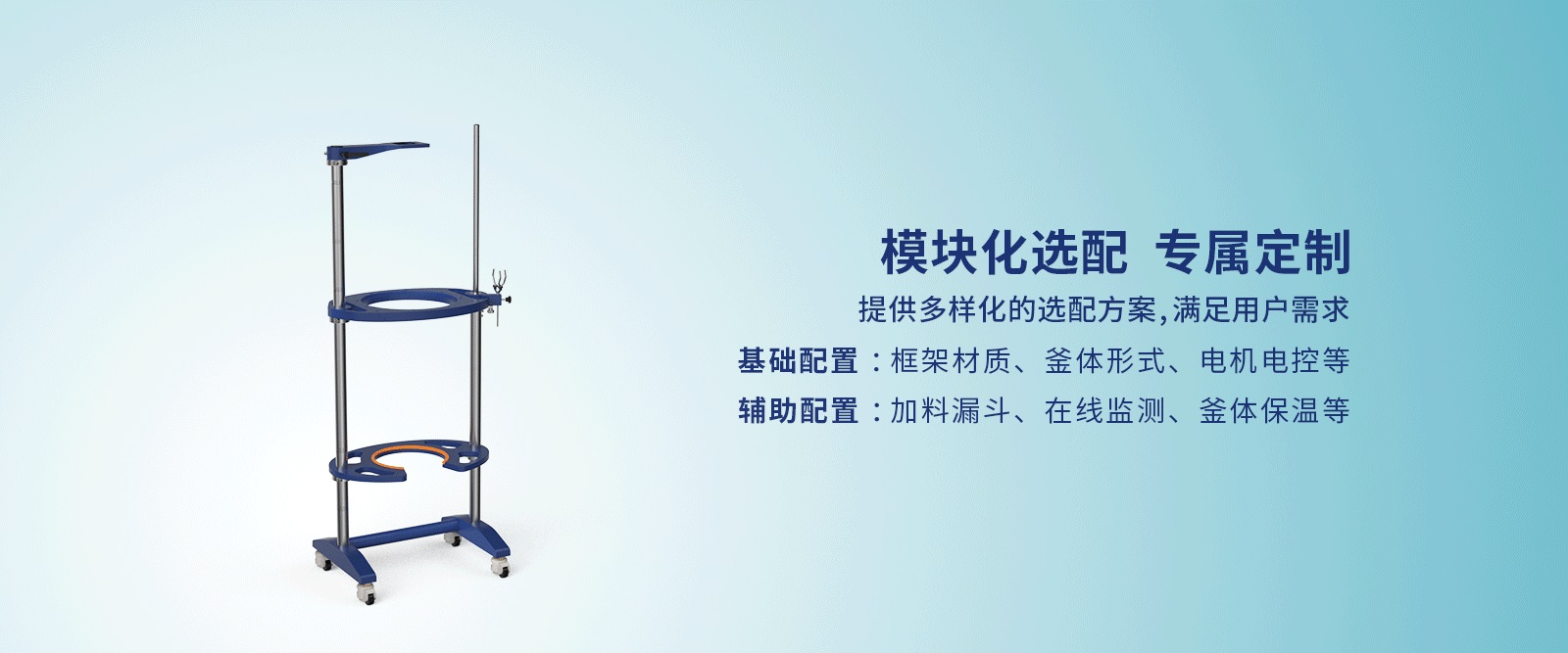8、模塊化選配,提供多樣化的選配方案,滿足用戶需求。基礎配置:框架材質,釜體形式,電機電控等。輔助配置:加料漏斗,在線監測,釜體保溫等。