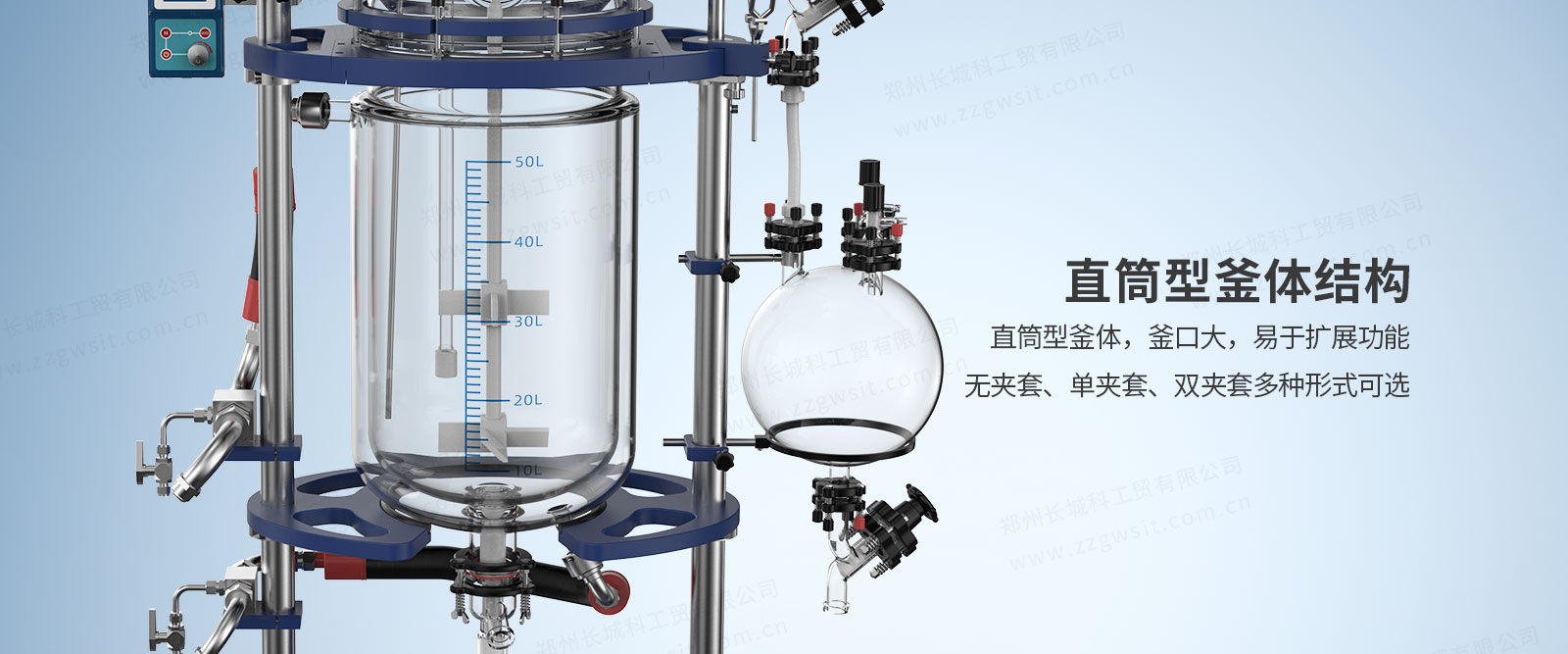 6、直筒型釜體結構:直筒型釜體,釜口大,擴展功能多,無夾套、單價套、雙夾套多種形式可選;